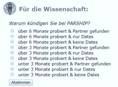 Das machen wir über eine Befragung von Leuten, die gerade dabei sind, sich von ihrer Online Dating Plattform wieder zu verabschieden.