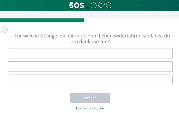Der eigentliche Persönlichkeitstest steht allerdings erst nach Abschluss einer Premium-Mitgliedschaft zur Verfügung. Der Test umfasst Fragen zu unterschiedlichen Themenbereichen wie Religion sowie Lebenseinstellung und Selbsteinschätzung. Anhand der Angaben wird ein Persönlichkeitsprofil erstellt und das intelligente Matchmaking bei 50slove aktiviert.