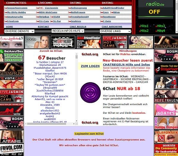 Wer das Chatfenster anklickt, der gelangt auf Werbeseiten, die als Weiterleitung zu anderen Erotik-Seiten dienen. Die (Werbe-) Links unter dem Chatfenster funktionieren alle einwandfrei. 6Chat ist also praktisch eine als Chat getarnte Link-Farm mit vielen Links zu diversen Erotik-Seiten.