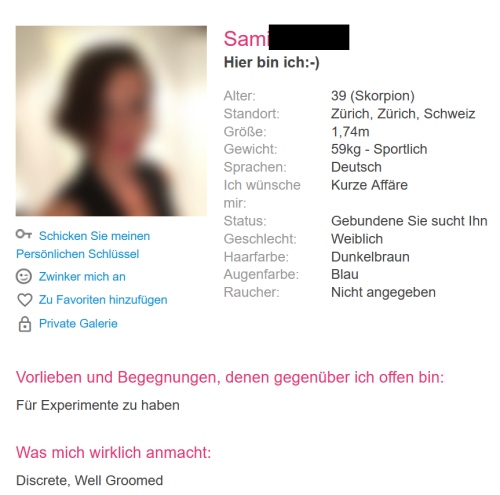 - Bitte schau‘ Dir mein Profil an um zu sehen, ob es dir gefällt. Wenn Du interessiert bist, «zwinker» mich auch an und ich werde den Kontakt initiieren.