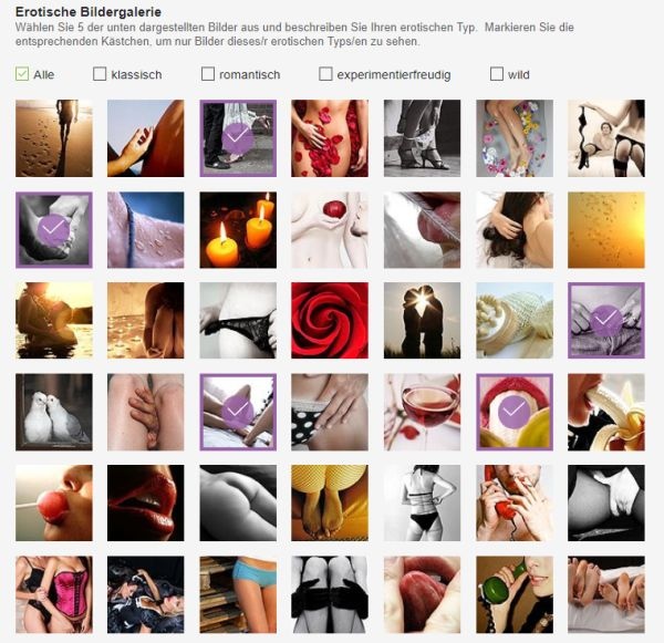 c-date definiert den Erotik-Typ auf Basis Ihrer sexuellen Vorlieben. Dabei wählen Sie aus 84 aufreizenden Bilder 5 aus, die Ihren sexuellen Vorlieben entsprechen. Diese Auswahl können Sie jederzeit variieren, sodass Sie auch unterschiedliche Kontaktvorschläge erhalten.