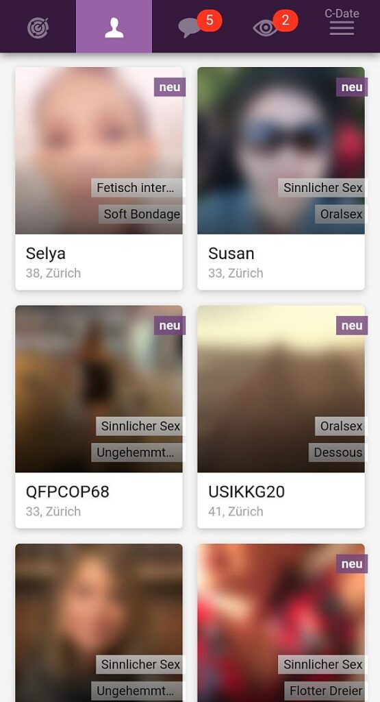 c-date vergibt bei der Anmeldung jedem Profil eine Chiffre-Nummer. Sehr unsexy! Allerdings können Sie sich frei einen Nicknamen bzw. ein Pseudonym überlegen, was über die Hälfte auch macht. Denn mit “Luna_Zürich” oder “LustAufDich” flirtet es sich leichter als mit “E2FJCG61” oder “UQHICB26”.