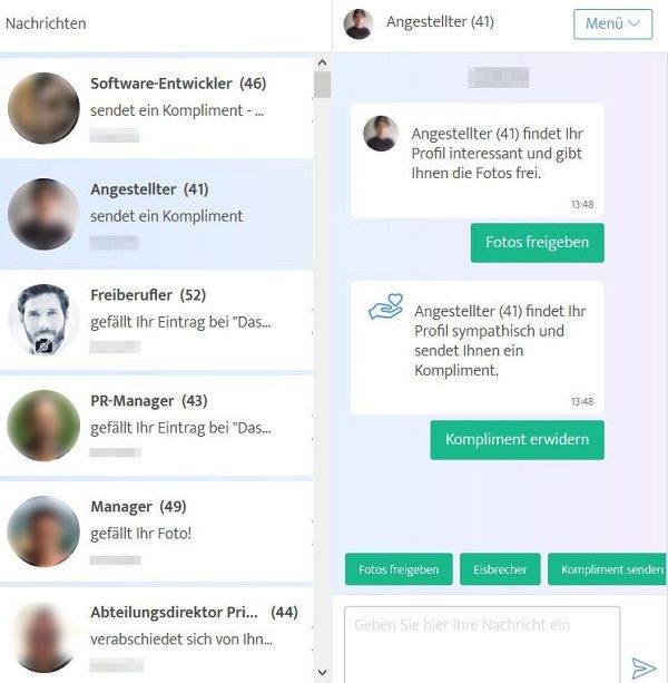 Bei unserem Test hatten wir nur unseren Vorstellungen entsprechende Partnervorschläge. Die Kommunikation mit den einzelnen Nutzern war sehr offen und freundlich. Durch die gut ausgefüllten Profile gibt es jede Menge Ansatzpunkte, um ein angeregtes Gespräch zu führen.