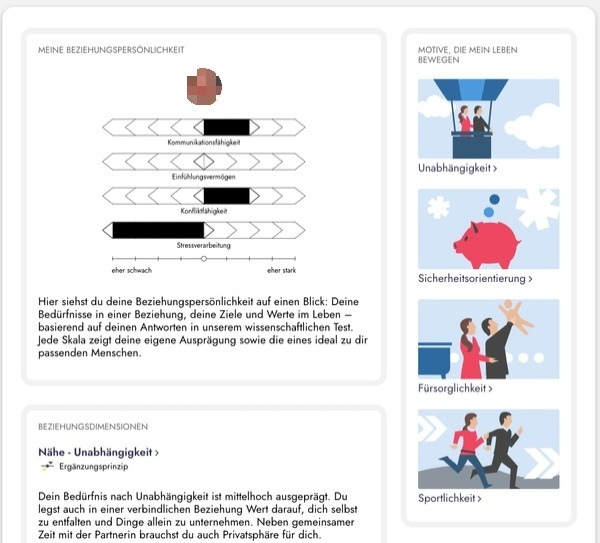 Der Persönlichkeitstest stellt u.a. fest, welche Lebensmotivationen Sie und ihre Partnervorschläge gemeinsam haben. Und welche nicht. So sah beispielsweise in unserem Praxistext der Motive-Teil aus: