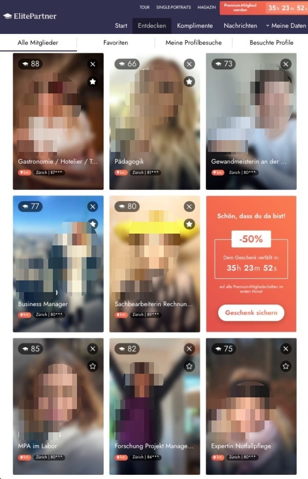 [LI-STERN]Mitgliederzahl und detaillierte Profile: Dank kontinuierlicher Werbung bleibt die Mitgliederbasis von ElitePartner.ch auch 2025 auf hohem Niveau. Die Profile sind wie gewohnt sehr detailliert, was eine präzise Einschätzung der Kompatibilität ermöglicht. Wer Wert auf Substanz statt Oberflächlichkeit legt, wird sich hier gut aufgehoben fühlen.