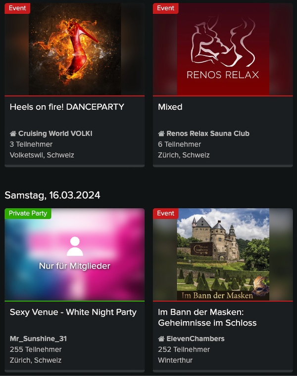 Zudem finden Sie unter dem Reiter “Events” jede Menge Veranstaltungen mit verschiedenen Schwerpunkten. Ob JOYclub Swinger-Party, Gangbang oder auch Foto-Events und Mitgliedertreffen – hier ist es recht einfach, die richtige Veranstaltung zu finden.