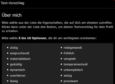 Mehr als Dreiviertel der Profile hat ausgefüllte Freitextfelder. Für Nutzer, denen eine Idee für ihre Freitextfelder fehlt, hat die Community einen tollen Service! Man wählt unterschiedliche Charakterzüge bzw. bevorzugte Eigenschaften aus und erhält einen vom System generierten – sinnvollen (!) Text, den man für sein Profil übernehmen kann.