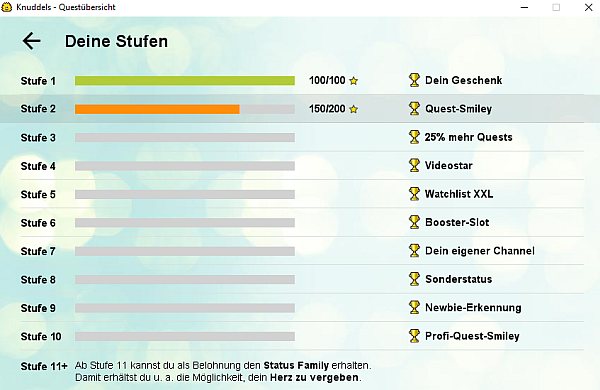 Wer sich bei Knuddels anmeldet, der kann bestimmte Quests zu erfüllen, welche wiederum bestimmte Stufen erschliessen. In Stufe 1 hat man beispielsweise die Quests bzw. Herausforderungen einmal zu chatten und einmal öffentlich zu reden.
