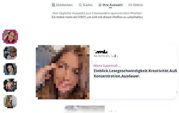 Zudem werden Ihnen unter “Ihre Auswahl” täglich 5 passende Singles vorgeschlagen, die mit Ihren Angaben im Profil gewisse Gemeinsamkeiten aufweisen. Dies erleichtert vielen Usern und Userinnen die Suche, da man sich hier nicht erst durch sämtliche Profile klicken muss.