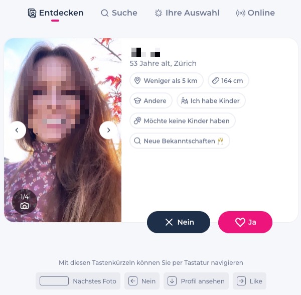 Zwei weitere Möglichkeiten, unverkrampft und ohne grosse Vorarbeit geeignete Profile zu finden, sind die Funktionen “Entdecken” und “Online”: Hier können Sie wie auf Tinder nach links und rechts wischen, je nachdem, ob Ihnen ein Profil gefällt oder nicht.