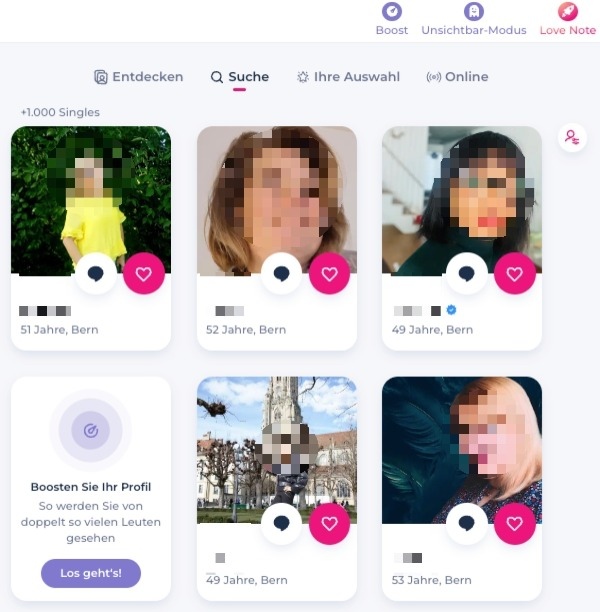Wenn Sie auf den Reiter “Suche” klicken, werden Ihnen bereits jede Menge Mitglieder präsentiert, denen Sie mit einem Klick auf das Herzsymbol ein Like oder einem weiteren Klick auf das Sprechblasensymbol eine Nachricht schicken können.