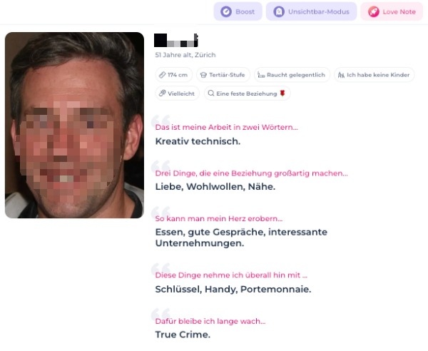 Absolut positiv ist uns bei LoveScout.ch aufgefallen, dass sehr viele Partnersuchende ihr Profil detailliert ausgefüllt und mit einem gelungenen Porträtfoto vervollständigt haben.