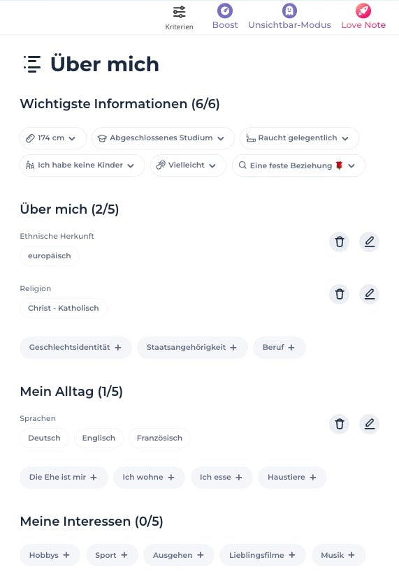 - Meine Beschreibung: Dies ist ein Freitext von 2000 Wörtern, in dem Sie sich ein wenig beschreiben und für Profilbesucher interessanter machen können.