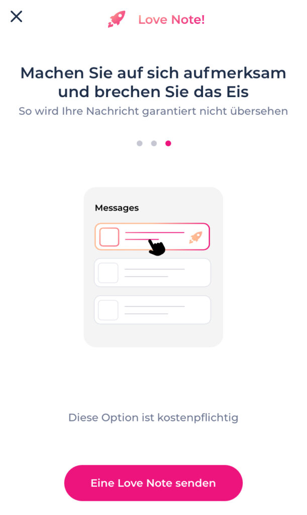 Mithilfe der kleinen Rakete können Sie anderen Singles Liebesbotschaften schicken und so auf sich aufmerksam machen, ohne die Person direkt anzuschreiben. Diese Funktion ist auch für User und Userinnen ohne kostenpflichtige Mitgliedschaft verfügbar.