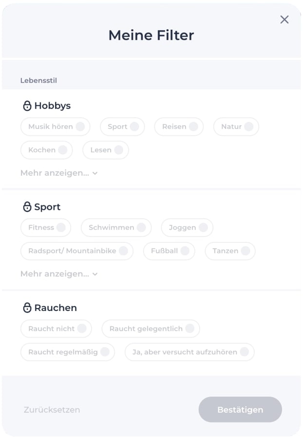 Im Bereich “Entdecken” finden Sie jede Menge Funktionen, die die Partnersuche spielerisch erleichtern sollen. Zum einen können Sie in der detaillierten Suche unter “Meine Filter” genau angeben, welche Voraussetzungen Ihr Gegenüber mitbringen soll.