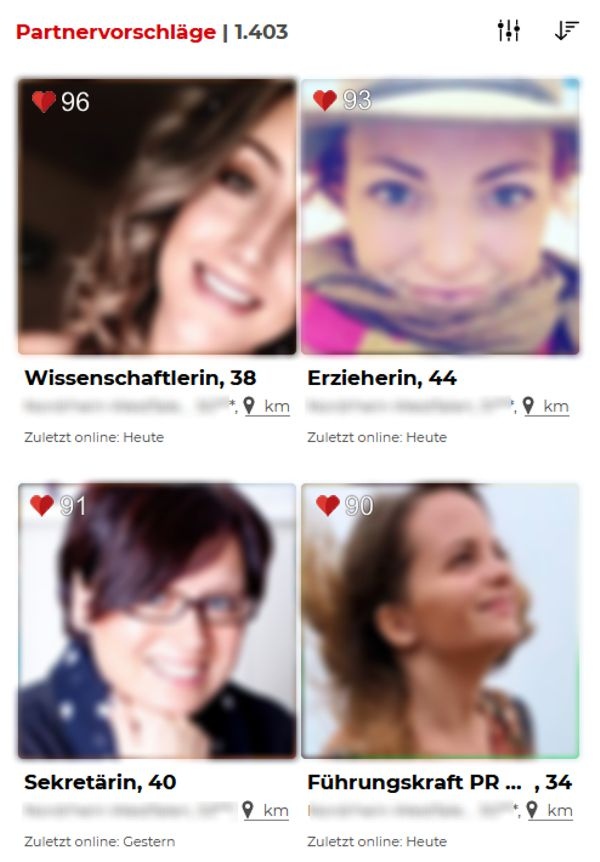 Das bedeutet aber nicht, dass Ihnen zu 80% ‚Karteileichen‘ präsentiert werden, denn natürlich bevorzugt der Algorithmus die Bezahler. Sie können davon ausgehen, dass deutlich über 50% Ihrer Partnervorschläge eine Premiummitgliedschaft haben.