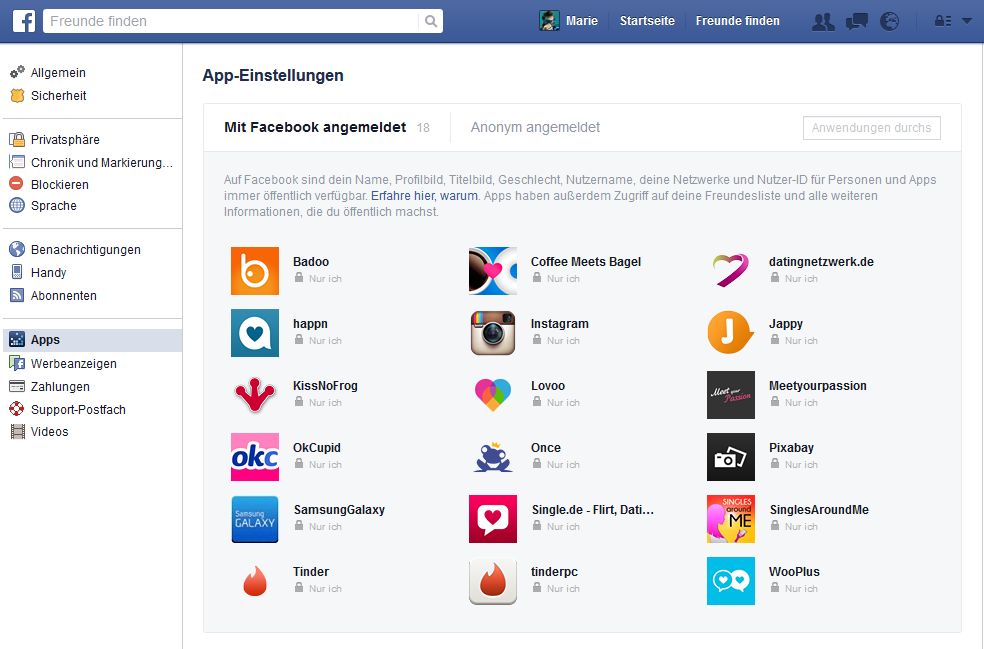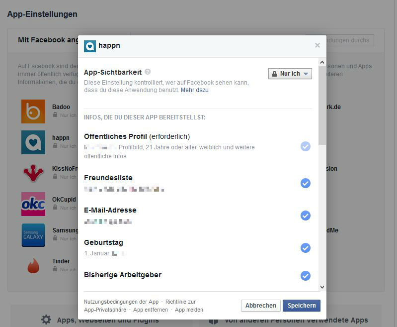3. Vergessen Sie zudem nicht – sofern Sie sich mit Ihrem Facebook-Account bei einer Dating App angemeldet haben – auch bei Facebook selbst die Zugriffsberechtigung der App zu löschen. Das Gleiche gilt übrigens auch für Dating Apps, bei denen Sie sich mit Ihrem Twitter-Account angemeldet haben. Das gilt vor allem für Dating-Apps, die die Profile z.B. mit Bilder von Instagram oder Songs von Spotify verknüpfen.