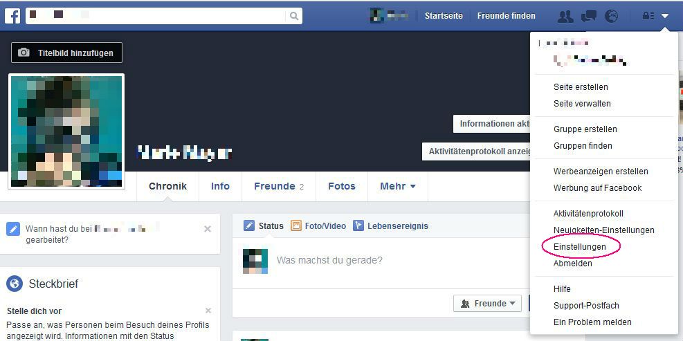 Loggen Sie sich mit den entsprechenden Zugangsdaten bei Facebook ein. Klicken Sie oben rechts auf das kleine Dreieck. Wählen Sie nun im Menü den Punkt «Einstellungen» aus.
