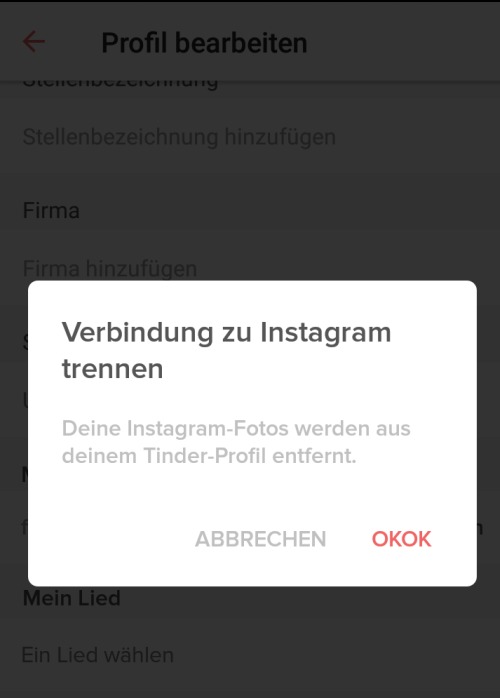 3. Dann klicken Sie auf «Verbindung trennen», bestätigen dies und schon ist das Tinderprofil wieder losgelöst von Ihrem Instagram-Account.
