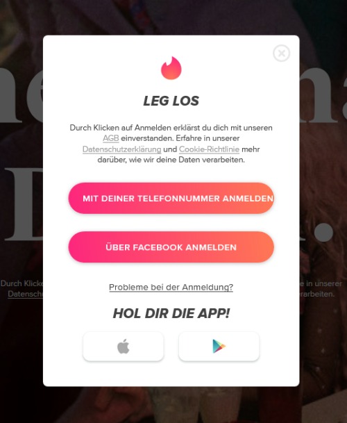 Bei Tinder z.B. können Sie sich via Telefonnummer oder Facebook-Login anmelden.