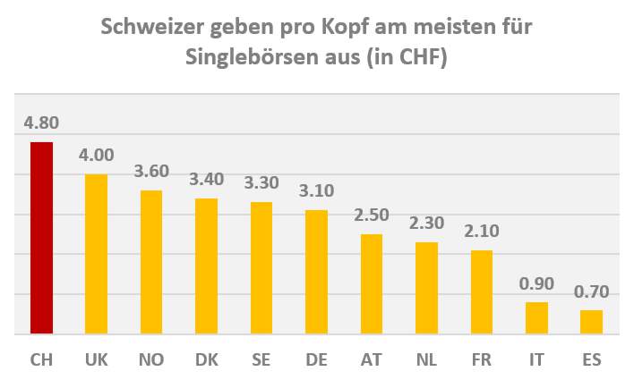 Die Schweiz ist bei der Internet Partnersuche die klare Nummer 1 in Europa. Keine andere Nation gibt verglichen mit den Eidgenossen für Partnerbörsen & Co. pro Kopf mehr aus: